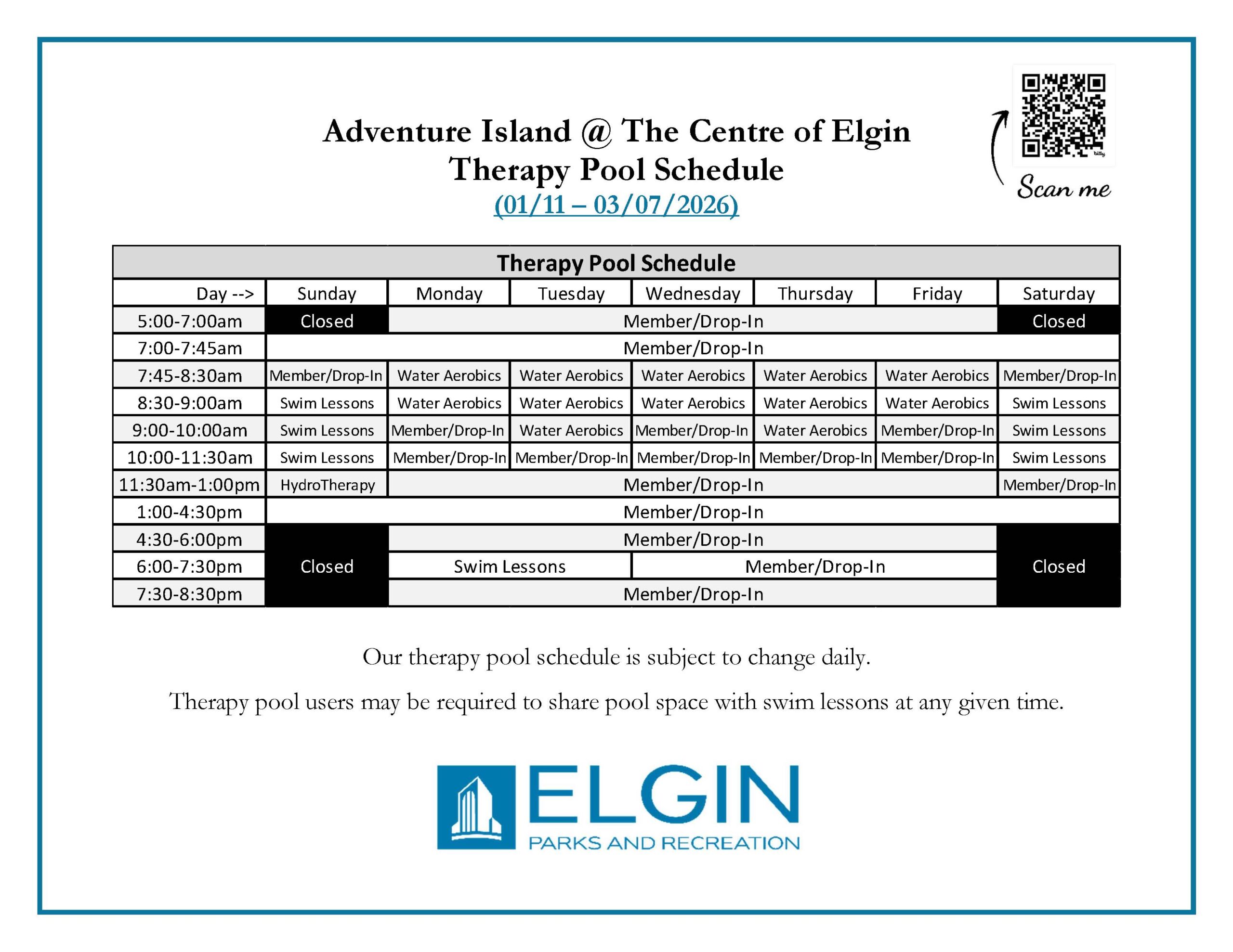 Please note that our Therapy Pool schedule is subject to change daily and Therapy Pool users may be required to share pool space with swim lessons at any given time.