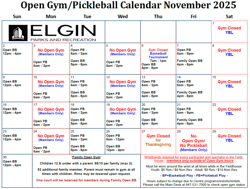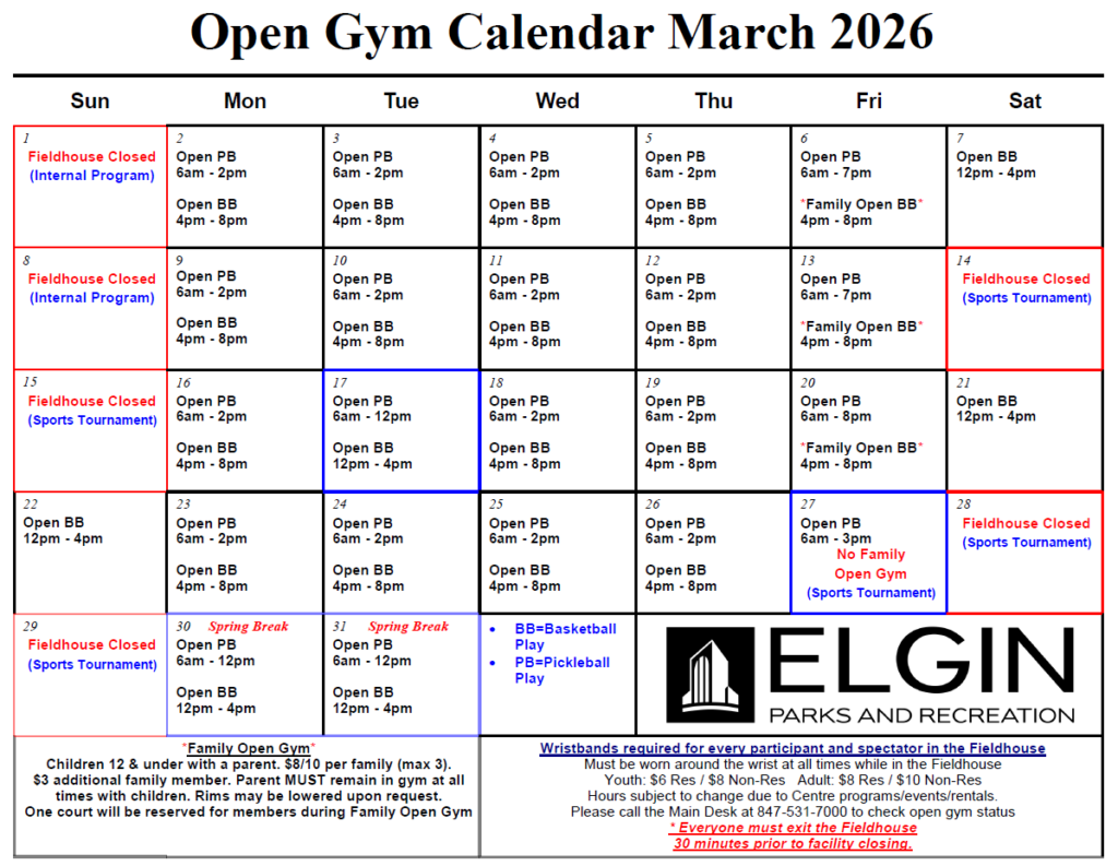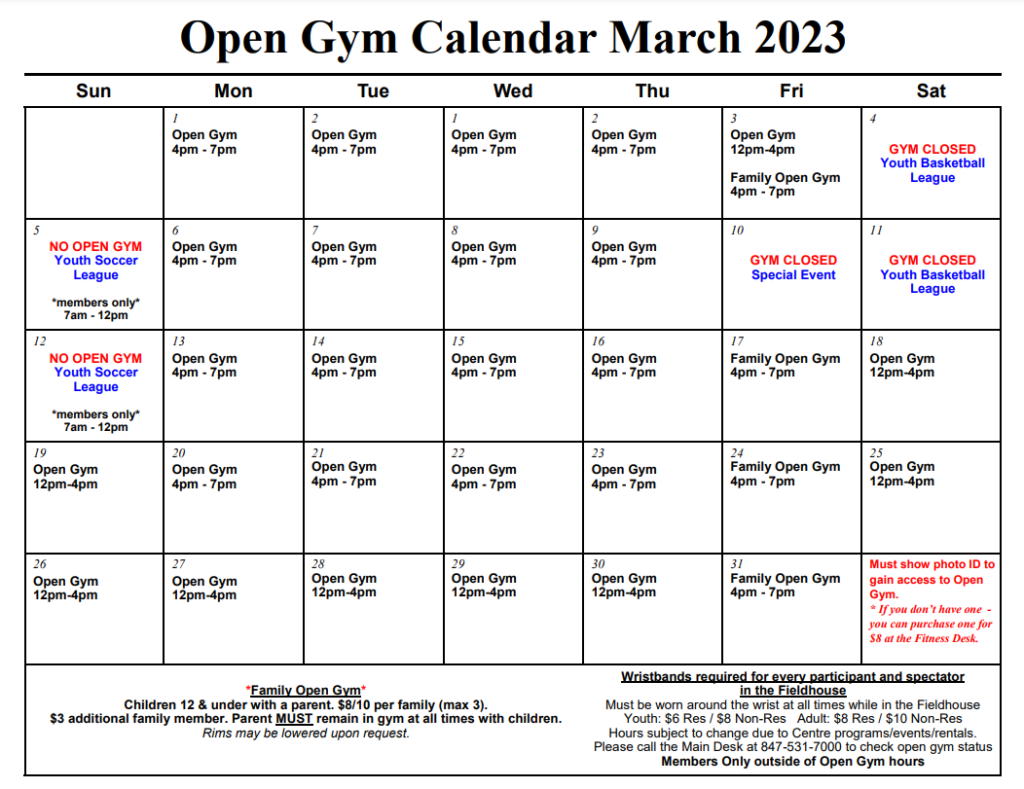 Open Gym hours are for non-members to play pick-up basketball in our Field House. There will always be one court reserved for members unless indicated on the monthly schedule on each day. PHOTO IDs are REQUIRED TO ENTER OPEN GYM. Member must provide valid membership card for wrist band. Driver’s License, State ID or School ID will all be acceptable. Photo Centre ID is available for purchase at desk for $8. This ID does not include Open Gym drop-in fee. Drop-In fee is required for entry.