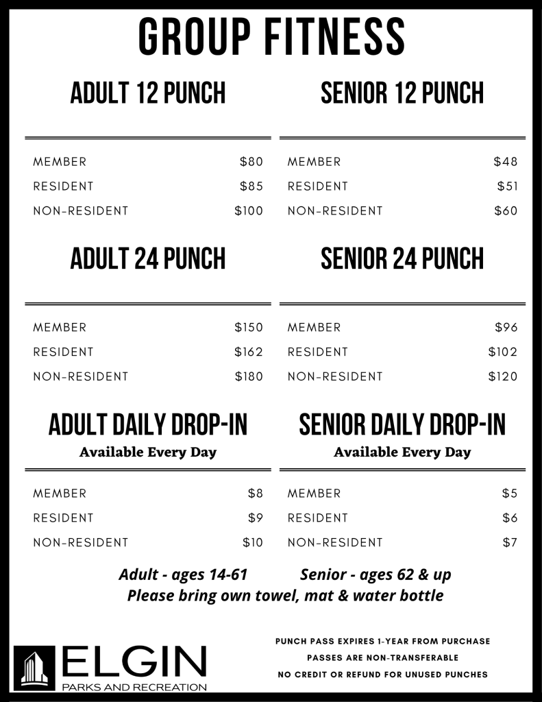 12 and 24 punch passes and daily drop-in fees are available for our group fitness classes. Purchase a punch pass and attend any class of your choice. Platinum memberships include unlimited group fitness classes. For a list of our classes and time go to the Fitness Classes page.