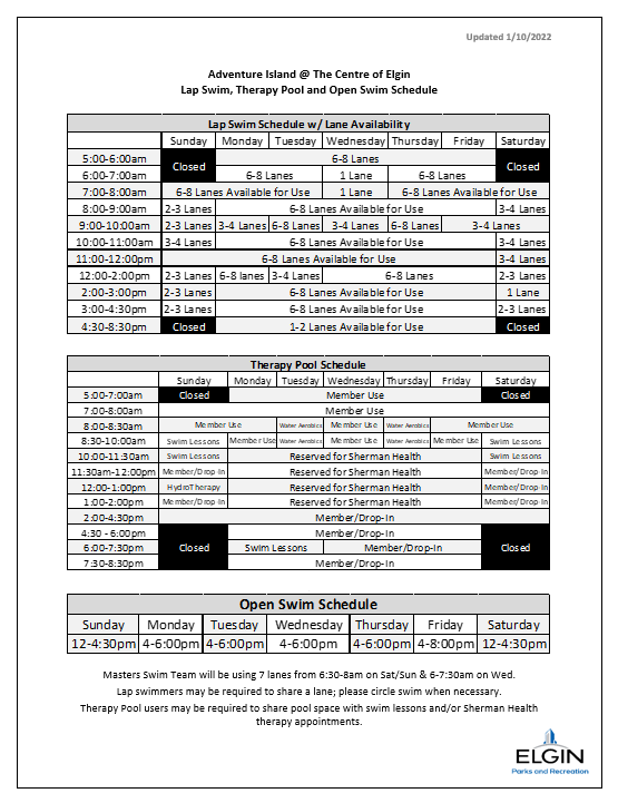 Lap, Therapy, Open Swim Schedule – Updated 1.10.2022